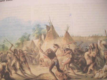A Fort Union non convenivano solo gli Assiniboine e i loro alleati Cree, ma anche Crow e, soprattutto, i loro mortali nemici, i Piedineri. George Catlin ebbe occasione di assistere all’arrivo contemporaneo di una banda di Cree e di una di Piedineri. Per impedire che si scontrassero, il bourgeois del tempo, McKenzie, li fece accampare ai lati opposti del forte, nella prateria, e fece loro deporre le armi per tutto il tempo del loro soggiorno, un fatto che testimonia certamente la sua grande influenza sulle tribù. Non ci furono problemi finché i Cree non tolsero le tende: all’ultimo momento uno di loro infilò la bocca del moschetto attraverso una fessura della palizzata e sparò, ferendo a morte uno dei Piedineri. Anche il principe Maximilian zu Wied e il suo pittore Karl Bodmer ci hanno lasciato ritratti di questi indiani; Bodmer dipinse anche una battaglia di Cree e Assiniboine contro Piedineri. Quando il principe fu a Fort Union giunse un gran numero di Assiniboine. Così egli narra il loro arrivo: “Verso nord ovest l’intera prateria era coperta da indiani in ordine sparso, con numerosi cani che trascinavano i travois carichi di bagagli; un gruppo serrato di guerrieri, circa 250 o 300, si era formato nel centro, simile a due reggimenti di fanteria, e avanzava veloce verso il forte. I guerrieri indiani marciavano a ranghi serrati…formavano una linea considerevole. Davanti al centro avanzavano tre o quattro capi, a braccetto, e dai ranghi si sentivano sparare colpi di moschetto. L’intera truppa di questi guerrieri ora iniziò le proprie originali canzoni, molte con toni improvvisi e spezzati. I cani carichi, guidati da donne e bambini, circondavano il nucleo dei guerrieri. Avanzarono fino a circa sessanta passi, poi si fermarono al fossato che correva dal Missouri fino a oltre il forte, e attesero, con il capo davanti a tutti, aspettando il nostro benvenuto”. Il benvenuto non tardò a farsi sentire, con colpi di cannone a salve. Gli indiani fidati, come questi, potevano accamparsi dentro il forte, e venivano fornite loro anche camere degli ospiti. Ovviamente quando si ubriacavano potevano diventare pericolosi e allora bisognava tenere i moschetti pronti.