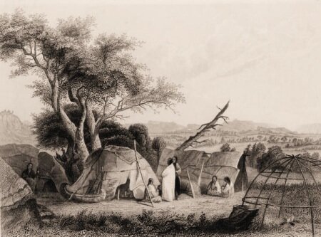 E così si misero in viaggio per cercare il sole e la luna. Giunsero ad un grande fiume, che Aquila sorvolò. Coyote nuotò, ma ingoiò tanta acqua che per poco non annegò. Si trascinò fuori con la pelliccia piena di fango, ed Aquila gli parlò.