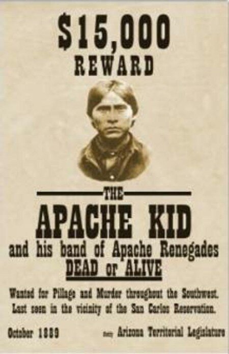 Dal 1890 al 1894 Apache Kid fu accusato di quasi ogni uccisione, stupro o depredazione avvenuti nel Territorio dell’Arizona. Anche i suoi detrattori capivano che egli non poteva essere dappertutto. è certo che egli evitò di essere catturato grazie ai suoi acuti sensi e alla sua perfetta conoscenza del terreno che aveva acquisito anche durante i suoi anni come scout dell’esercito. Inoltre Kid aveva una famiglia numerosa e poteva contare su una rete di amicizie che gli passavano informazioni e gli procuravano rifornimenti. Coloro che lo conoscevano meglio sapevano che non era l’assassino diavolo rosso in cui la stampa locale l’aveva trasformato. Quasi certamente, comunque, Kid uccise alcune persone, rubò cavalli e saccheggiò per sopravvivere. Gli ufficiali dell’esercito a San Carlos pensarono bene di imprigionare Eskiminzin, il capo degli Aravaipa imparentato col ricercato, che aveva sposato una sua figlia o una sua cognata.