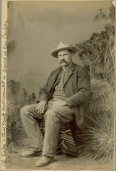 “I 40 acri dell’inferno” Britton Davis definì il posto, una piana bruciata dal sole, arida e spoglia, spazzata da venti forti ed infestata da miriadi di insetti dove, in estate, 40° non erano la temperatura massima e dove le precipitazioni erano talmente rare da sembrare un evento eccezionale. Qui Kid arrivò quando aveva circa 15 anni ed imparò a frequentare ed a conoscere gli uomini bianchi. Presto, coloni, militari e ranchers impararono a riconoscere questo giovane apache che, coi soldi guadagnati con vari lavoretti, acquistava le vesti e le calzature dell’uomo bianco. Poichè il suo nome nativo era per loro impronunciabile lo chiamavano semplicemente Kid e così il giovane aravaipa è chiamato nei ruolini degli scouts indiani dell’esercito. Del resto il suo nome originario è incerto; Phyllis De La Garza lo chiama Haskaybayntayl, cioè ” alto e bello e farà una fine misteriosa”, un nome a dir poco profetico nel suo caso; ma altri nomi sono stati proposti, come Oskabenaltez, Eskibinantl, Oyesonna, Zenogolache ecc. Nel suo libro, William Sparks insistette che il vero nome di Apache Kid era Skibenanted, ma non ne suggerì mai il significato. Sayes, membro della banda di Kid, la SI di San Carlos, affermò che il suo vero nome era Skisininty. Apache Kid lavorò come mandriano presso il ranch Redmont di Globe, che forniva carne da macello e si distinse per l’abilità nel tiro, durante le attività di abbattimento dei manzi destinati agli Apaches presso il corral dell’agenzia. A San Carlos Apache Kid conobbe il virginiano Clay Beauford, capo della polizia indiana di John Clum; e fu amico di Tom Horn. A San Carlos divenne, secondo Tom Horn, il “pet indian” di Al Sieber, capo civile degli scouts. Sieber, nato in Germania nel 1844, si era trasferito in America con i familiari, a Lancaster, Pennsylvania e poi in Minnesota, dove si arruolò tra i Volontari e fu ferito a Gettysburg. Raggiunta l’Arizona divenne capo degli scouts del Generale Crook e personaggio temuto e rispettato da chi lo conosceva. Per quanto la leggenda consideri Kid e Sieber copme strettamente legati, fino al ferimento di quest’ultimo nel 1887, in realtà i documenti esistenti non fanno immaginare un rapporto così stretto tra i due.