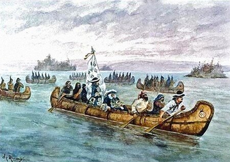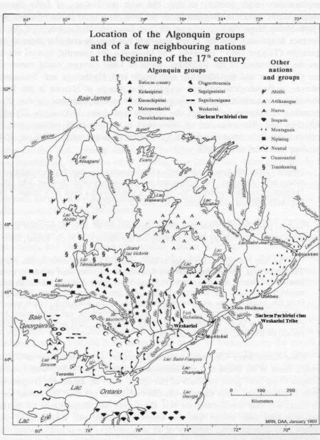 Quando i francesi entrarono nel Canada, la notizia del loro insediamento si sarebbe diffusa da tribù a tribù. Gli Algonkins erano stanziati lungo il corso del fiume “Outaouas” (Ottawa River), mentre gli Huron “vivevano nel loro antico paese” (“Huronia”). Questi ultimi, dopo essere stati in guerra con gli Irochesi, nel 1624 si sarebbero riappacificati con i loro nemici storici, molti gruppi Huron avrebbero allora iniziato a visitare gli insediamenti francesi per poi entrare in contatto con i missionari. Nel 1644 i francesi avrebbero promesso agli Huron di difenderli dagli attacchi degli Irochesi, ma questi assalirono di sorpresa un loro villaggio, lo distrussero e catturarono una trentina di prigionieri; l’attacco fu veemente e molti Huron fuggirono verso altre terre, alcuni gruppi si spinsero a ovest fin nell’Illinois, altri raggiunsero le colonie francesi sul San Lorenzo.