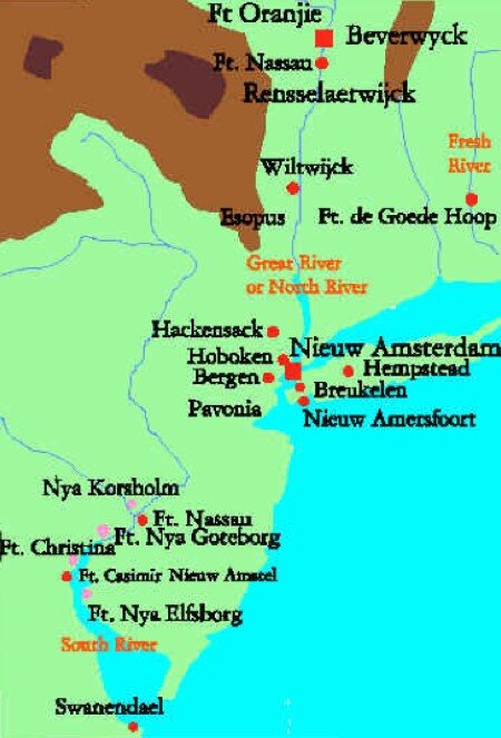 Quando gli Olandesi giunsero in America, decisero che la capitale coloniale doveva essere su un’isola alla foce di un grande fiume: non Manhattan, ma High Island (oggi Burlington Island) sul fiume Delaware, e vi costruirono un forte commerciale. Quando Minuit diventò direttore, però, trasferì la capitale a Manhattan, mentre il forte sul Delaware veniva trasferito più a monte e chiamato Fort Nassau. Quando Minuit, disgustato dagli Olandesi, passò agli Svedesi fondando Fort Christina ed escludendo Fort Nassau dal commercio con gli Indiani, Stuyvesant reagì abbandonando Fort Nassau e costruendo un nuovo forte più ad ovest. Oggi sul sito di Fort Nassau c’è Gloucester City (nello stato del New Jersey), adiacente a Camden e di fronte a Filadelfia (Pennsylvania), sull’altra riva, che nacque anch’essa grazie ad un nucleo iniziale di Olandesi. Alla competizione fra Nuova Olanda e Nuova Svezia dobbiamo anche Newcastle (Nieuw Anstel, ubicata vicino al sito del forte olandese Casimir), Salem (la vecchia Fort Elfsboro, svedese), e lo stesso stato del Delaware, nato dal “patronato” della WIC di Swaanendael (“Valle dei Cigni”), fondato nel 1631 con 28 uomini e distrutto dagli Indiani, sul cui sito sorge la città di Lewes.