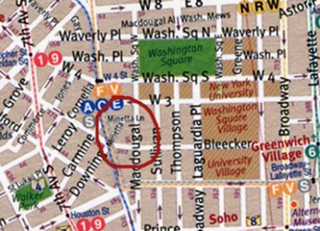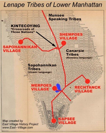Sapokanican era il nome di uno dei molti villaggi Lenape che esistevano a Manhattan prima dell’arrivo degli Olandesi: era collocato nella porzione sud ovest dell’isola, sulle rive di un torrente ricco di trote che gli Indiani chiamavano Minetta. Mitche Minetta era lo spirito serpente che aveva tormentato i Lenape al tempo della creazione, ed era stato vinto e trasformato in un serpeggiante corso d’acqua dall’eroe culturale Nadabozo. Si può dire che gli Indiani di questo villaggio stagionale siano stati i primi residenti del Greenwich Village; il Minetta Creek scorre ancora sotto il Village. Queste acque “demoniache” nascono in una palude nei pressi dell’attuale Flatiron Building. C’è una placca dorata nell’atrio di un palazzo al n°2 della 5th Avenue che spiega la storia. Il Minetta scorre poi sotto la fontana di Washington Square Park, mentre la Greenwich Avenue ripercorre il vecchio sentiero a piedi che portava dal fiume Hudson al Minetta.