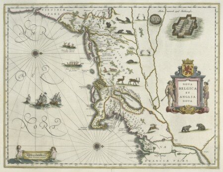 La mappa di Blaeu “NOVA BELGICA ET ANGLIA NOVA” – 1635 (la vista è da nord, per cui troviamo l’Atlantico a sinistra e il continente a destra)