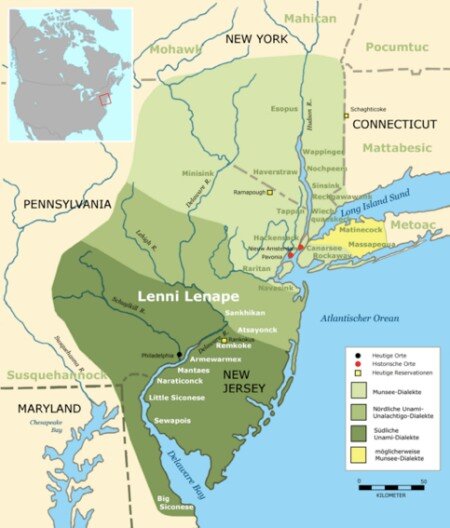 I linguisti hanno usato il termine “lingua Delaware” per identificare la forma di comunicazione usata dagli Indiani che abitavano Lenapehoking, la terra dei Lenape, noti anche come Delaware nel periodo storico. Le bande che vivevano in genere a nord del fiume Raritan parlavano un dialetto M o Munsee, mentre quelli che vivevano a sud parlavano un dialetto U o Unami. In seguito, nel XVIII secolo, mentre gli indiani migravano da Lenapehoking all’Ohio e l’Indiana, i nomi delle bande o piccole tribù come Lappan, Raritan, Minisink, ecc. furono dimenticati e per tutti fu usato il termine Munsee, con cui sono conosciuti ancora oggi. I nomi, infatti, avevano senso solo nel contesto geografico in cui abitavano i vari gruppi: i Manhattan erano quelli dell’isola collinosa, i Muscoota quelli del posto dei giunchi, i Minisink quelli dell’isola, i Sahnkians quelli del trapano da fuoco e gli Unami la gente a valle del fiume. Non sappiamo come si chiamassero in epoca preistorica, così gli archeologi li chiamano per convenienza proto-Munsee per il periodo dal 1000 al 1600 d.C., così come vi sono i proto-Unami. In seguito le varie bande Remkokes, Narantican, Mantaes, ecc., identificate dagli europei nel XVII secolo, diventano nel XVIII sec. gli Unami o Delaware veri e propri (Lenni Lenape, la vera gente). Gli archeologi riconoscono due distinte fasi del tardo Periodo delle Terre Boscose nell’area proto-Munsee: la fase Pahaquarra (1000-1350 d.C.) e quella Minisink (1350-1600 d.C.) (Kraft 1986). Secondo molti studiosi i Lenape giunsero nella regione medio atlantica circa 3000 anni fa; i Lenape, dal canto loro, ritengono che i loro antenati siano giunti nell’area di New York da occidente nel lontano passato (Grumet 1989).