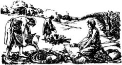 Ogni villaggio conteneva in media 200 persone e ogni 8-12 anni doveva essere spostato a causa dell’esaurimento degli orti fertilizzati col sistema del “taglia e brucia”, la penuria di legna da ardere e l’accumulo di rifiuti dentro e intorno al perimetro. Gli orti erano ricavati aprendo la foresta col fuoco, erano piuttosto piccoli e coltivati a colture miste di mais in primo luogo, fagioli, zucche e girasoli. Gli orti, che producevano una quantità relativamente alta di cibo, erano di fondamentale importanza nell’economia indiana, producendo intorno al 70% del fabbisogno alimentare insieme alla raccolta di frutti selvatici, ed erano, come quest’ultima, un’incombenza femminile. Gli uomini partivano dal villaggio in primavera e tornavano in agosto per il raccolto e le cerimonie del Grano Verde.