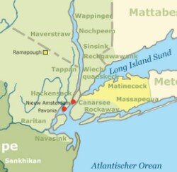 Nella parte settentrionale dell’area Lenape – il nord del New Jersey e il New York sudorientale – i Munsee erano così distribuiti: gli Esopus occupavano l’area occidentale dello spartiacque del fiume Hudson, tra le montagne Catskill e gli altipiani a West Point e i loro sottogruppi comprendevano i Waorameck, i Warranawankong e altre piccole tribù. Gli Indiani delle Catskill a nord erano, pare, di lingua Mahican. Nell’interno, alle sorgenti del fiume Delaware, oltre Delaware Water Gap, abitavano i Minisink, a sud degli altipiani a ovest dell’Hudson vivevano gli Haverstraw, i Tappan e gli Hackensack. I Raritan vissero sul basso corso del fiume Raritan fino al decennio 1640, poi migrarono a causa delle alluvioni e degli attacchi degli Indiani del Delaware (lo stato attuale) e degli Olandesi; dopo il 1649 i “Raritan” furono in realtà immigrati Wiechquaeskeck provenienti da est del fiume Hudson. I Navasink abitavano negli altopiani proprio a sud di Sandy Hook Bay. Tutti i Munsee, dagli Haverstraw ai Navasink, erano strettamente associati politicamente. Un altro gruppo di lingua Munsee abitava a est dell’Hudson: i più settentrionali oltre ai Nochpeem erano i Wappinger, su gran parte delle contee di Dutchess e Putnam; in seguito Wappinger divenne sinonimo di Indiani degli Altipiani. Andando a sud c’erano i Kichtawank nella contea di Westchester settentrionale, i Sinsirk intorno a Ossining, i Wiechquaeskech nell’area di Terrytown-Dobbs Ferry e i Rechgawawank tra Yonkers, il Bronx e Manhattan. A est i Munsee si spingevano fino a Five Mile River (Darien-New Canaan), oltre il quale vivevano gli indiani Norwalck di lingua Quiripi. Gli indiani di Long Island erano legati culturalmente, politicamente e linguisticamente a quelli dell’area attorno Manhattan: i Nayack, i Marechkawieck e i Canarsaee a Brooklyn, talvolta raggruppati sotto il nome generico di Canarsee, poi i Rockaway da Newtown a parte di Hampstead e forse i Messapequa a Flushing, North Hampstead, Oyster Bay meridionale e Hungtington e i Matinecock a nord dei Messapequa.