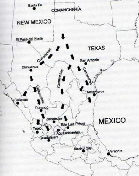 Dopo il 1830 i Comanches iniziarono una continua invasione della frontiera orientale dal Chihuahua fino alla costa. Conducevano a nord immense mandrie di cavalli e muli e uccidevano, o prendevano prigionieri, tutti coloro che incontravano. Vi fu un ulteriore aumento della loro attività nel 1840 e 1841, quando war parties molto numerosi penetrarono all’interno del Messico e presto il network operativo Comanche coprì buona parte del Chihuahua, Nuevo Leon, Tamaulipas, Durango, Zacatecas e San Luis Potosi. Quando scoppiò la guerra tra Messicani e Americani, le bande raggiunsero i Tropici, penetrando in un nuovo mondo di giungle e alte sierras. Durante questi raids videro, sugli alberi, le kwasi taivo, gli “uomini con la coda”, ovvero le scimmie. Furono attivi in Jalisco e assalirono, almeno una volta, la città di Queretaro, che dista solo 135 miglia da Mexico City. I loro war trails si estendevano per 1000 miglia, circa 15 gradi di latitudine, a sud della Comancheria.