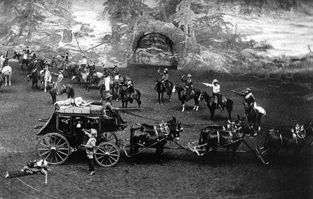 Già, perché il “marchio di fabbrica” di questo rutilante carrozzone era proprio l’autenticità dei personaggi: dai protagonisti della scena come Annie Oakley, ai semplici figuranti, come cowboys che domavano cavalli selvaggi o si esibivano in ardite roteazioni dei loro lazos, pistoleri che inscenavano duelli, infallibili tiratori che centravano difficilissimi bersagli, ed infine indiani, che simulavano sanguinosi assalti alle diligenze, finendo, però, immancabilmente per essere sconfitti.