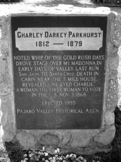 Nel 1867 nelle liste elettorali della contea appare il nome di Charley Parkhurst. Nel 1868 vi furono le elezioni presidenziali nelle quali venne eletto il generale Ulysse Grant. Per questo motivo Parkhurst entrò nella leggenda come la prima donna che votò negli Stati Uniti, infatti il suffragio universale si ebbe solo nel XX secolo quando fu introdotto un emendamento alla Costituzione. I documenti che comprovano che il nome di Parkhurst fosse nelle liste elettorali esistono mentre quelli con i nomi di chi votò andarono dispersi. Pertanto questo episodio non è sicuro.