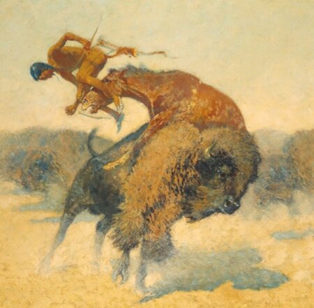 “Allora ci fu una grande polvere; tutti gridavano e tutti i cacciatori si precipitarono a uccidere, ognuno per conto suo. Erano tutti quasi nudi. con le loro faretre piene di frecce appese a sinistra, e si buttavano a cavallo addosso al bisonte e lo colpivano dietro la spalla sinistra. Alcune delle frecce penetravano fino alle penne e a volte quelle che non si imbattevano in un osso uscivano dall’altra parte. Tutti erano molto felici.”
