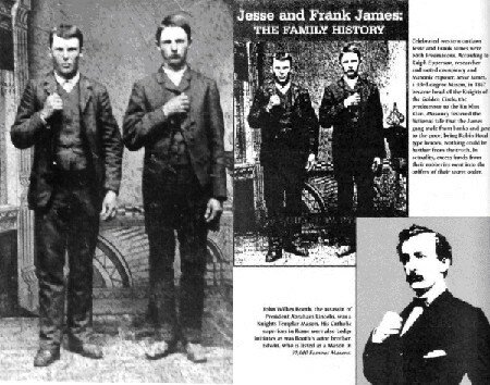Affinità: Libro contemporaneo ai fatti narrati sull’ordine dei Cavalieri. Dallo stesso un’immagine dei un rituale dell’Ordine e quella di uno dei primi membri in abbigliamento medevalesque. Sempre in un abbigliamento cavalleresco, ma che si ispira alla moda del XIX sec. un incontro dei cavalieri a Brownwood, in Texas. L’immagine è l’unica fotografia conosciuta di un raduno, è collocabile tra la fine del 1800 e l’inizio del 1900 e la sola persona che è stata identificata è l’industriale Henry Ford. Notare lo posa della figura al centro in seconda fila (sopra quella stranamente vestita da pontefice) che richiama con la posa le immagini dei fratelli James e di Booth.