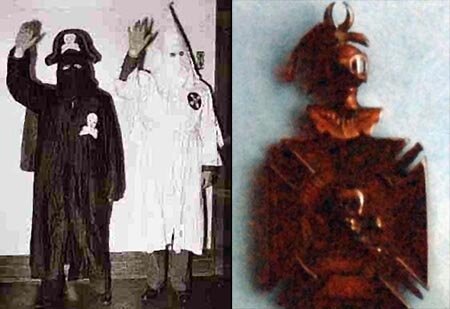 Affinità: fotografia non databile (ma presumibilmente XX sec.). Sulla destra un membro del Klan insieme ad un altro di una confraternita non ben identificata (forse un Cavaliere). A lato un medaglione dell’Ordine (notare il teschio presente)
