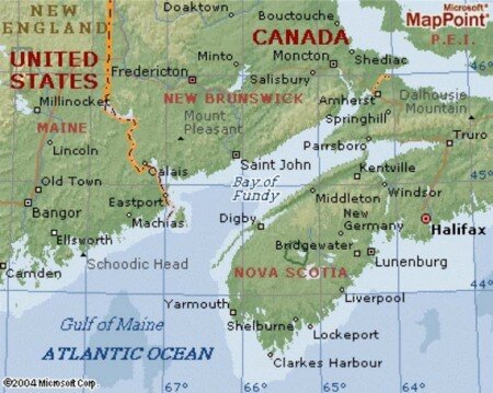 La penisola di Acadia/Nuova Scozia, con la posizione di Lunenburg