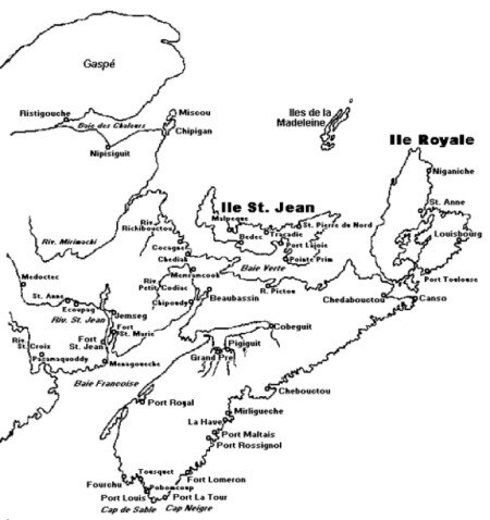 L’Acadia è un territorio ubicato nel Canada nord-orientale, appena al disotto della penisola di Terranova. E’ composto dalla Penisola Acadiana (ora Nuova Scozia), dall’Acadia continentale (ora New Brunswick), e dalle isole Royal (Cap Breton) e Saint Jean (Prine Edward). Era stato occupato da coloni francesi fin dal 1604, ma quasi subito anche gli Inglesi cominciarono ad accampare diritti sulla regione, sebbene i primi veri tentativi di conquista dell’Acadia da parte degli Inglesi cominciassero nel 1710. Lungo tutti i seguenti cinquantacinque anni gli Acadiani rifiutarono sempre di siglare un giuramento di fedeltà agli Inglesi. Anzi, in questo periodo gli Acadiani parteciparono a varie operazioni condotte dalla milizia francese contro i Britannici, e difesero le vitali strade di rifornimento ai forti francesi di Louisbourg e Beausejour.