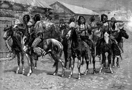 La sensazione di noia e fastidio che stava già iniziando a impadronirsi dell’agente fu però all’improvviso raggelata da una serie di spari accompagnati da urla che potevano essere di rabbia come di trionfo. Il rumore dei cavalli al galoppo si fece sempre più forte e in pochi minuti un gruppo di ventuno giovani Crow dipinti con i colori di guerra si fermò con aria minacciosa davanti agli uffici dell’agenzia, sparando a mo’ di sfida un’ultima raffica in aria. La porta dell’ufficio si aprì di colpo e Tom Stewart, l’interprete mezzosangue dell’agenzia mosse alcuni passi esitanti per poi arrestarsi, come fulminato, alla vista dei guerrieri armati. Uno di essi – evidentemente il loro capo – si voltò ridendo verso i suoi compagni e, smontato da cavallo, avanzò deciso verso Stewart, affondandogli la propria pistola nel ventre.