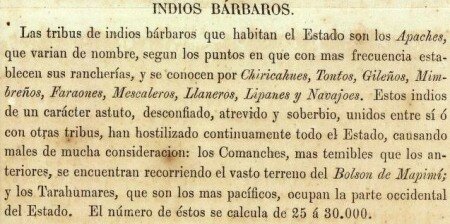 Ma il nemico più formidabile, il più temuto dagli abitanti del Durango e Chihuahua sono i bellicosi Comanches che, dalle loro lontane praterie oltre il Rio del Norte e il Pecos, in certi periodi dell’anno e annualmente, organizzano regolari spedizioni contro questi stati e, frequentemente, anche più all’interno (come l’anno scorso nelle vicinanze di Sombrerete), con lo scopo di procurarsi animali e schiavi, uomini e donne giovani, e massacrare gli adulti nella maniera più barbara e sistematica”.