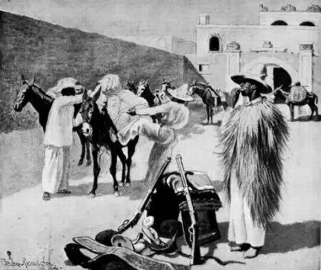 Con lo scopo di non far conoscere gli affari interni del Chihuahua da mesi, a nessuno, era consentito di lasciare lo stato e così, quando fu di pubblico dominio che il governatore Angel Trias aveva concesso carta bianca a Ruxton per procedere al nord, fiorirono molte supposizioni. Per alcuni Ruxton era il depositario di messaggi di pace tra il governo Messicano e gli Americani, per altri era un Colonnello Inglese diretto in Oregon per discutere di quel territorio conteso. Il fatto misterioso che a un viaggiatore straniero fosse concesso quello che era stato rifiutato ai più influenti cittadini dello stato, fu sufficiente a promuoverlo a essere “qualcuno” e così, la mattina della partenza, si presentò alla sua porta una scorta formata da tre soldati. Vestivano uniformi “originali”. Uno portava uno sporco cappello di paglia a larga tesa, un altro un fazzoletto annodato intorno alla testa. Uno indossava un pezzo di una giacca militare, un altro una una camicia lurida, senza maniche, con un pastrano strappato e aperto al vento che arrivava alle ginocchia. Uno aveva una spada arrugginita e una lancia, un altro una pistola senza cane, il terzo arco e frecce. Tutti erano senza stivali. Sebbene le notti fossero alquanto fredde, avevano in comune solo un lacero sarape.