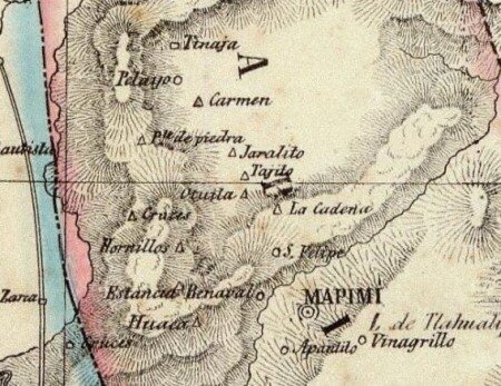 “El Real de Mapimi” scrive Ruxton “è situata su una pianura ai piedi di una montagna chiamata, per la presunta somiglianza a una borsa, il Bolson de Mapimi. Le sierras che circondano la pianura sono ricche di metalli preziosi ma, per la paura degli attacchi Indiani, non sono mai state sfruttate.