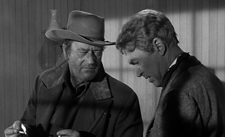 Nonostante le difficoltà incontrate al botteghino con “La battaglia di Alamo”, la sua granitica immagine non era stata neppure intaccata, né venivano messe in discussione le sue qualità di interprete e regista. Ford credeva ciecamente in lui per costruire il suo necrologio della Frontiera: occorreva un uomo leale ed onesto, senza timore, orgoglioso e un po’ immodesto– “Liberty Valance è il miglior pistolero a sud del Pickett Weir…dopo di me!” – che riassumesse in sé questi valori insieme alla tipica ingenuità del personaggio dall’animo semplice.