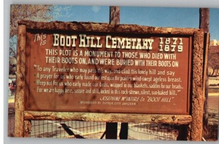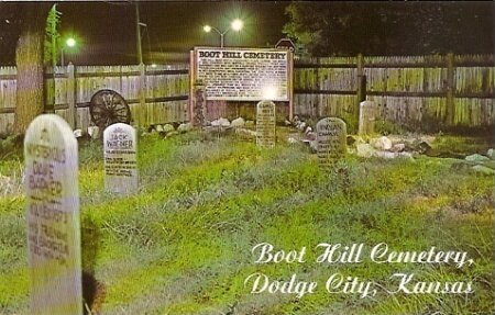 Dodge City, paradiso di giocatori di professione, assassini e prostitute, dove ognuno porta ai fianchi un revolver e quando qualcuno muore, lo fa regolarmente con gli stivali ai piedi. Anche qui, come in ogni altra città, esisteva un cimitero. A Dodge, però, era chiamato “Boot Hill”, cioè la collina degli stivali, perché la maggior parte degli occupanti erano appunto morti ammazzati con gli stivali ai piedi. Nel 1880, Mike Sutton, procuratore legale, ricordò che nel 1872 un uomo fu ucciso a pochi metri dalla sommità della collina. Il corpo dell’uomo rimase là per terra per alcune ore sino a quando verso sera fu scavata una buca dove il cadavere dell’uomo fu interrato. Era il primo uomo a essere sepolto su quella collina, subito seguito da altre venti o trenta persone. La collina divenne così il cimitero di Dodge City. Nel 1878 fu decisa la costruzione di un nuovo cimitero, il “Prairie Grove Cemetery” dove furono trasferite le salme giacenti al “Boot Hill”.