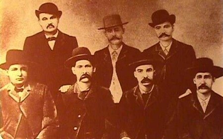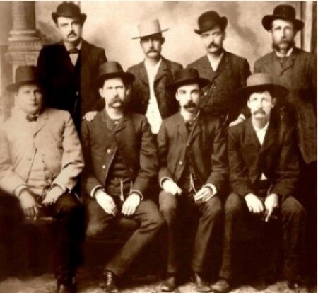 Commissione di pace di Dodge City. Da sinistra, seduti: Charlie Bassett, Wyatt Earp, Frank Mc. Laine, Neal Brown. In piedi: Bill Harris, Luke Short, Bat Masterson e W. F. Petillon.