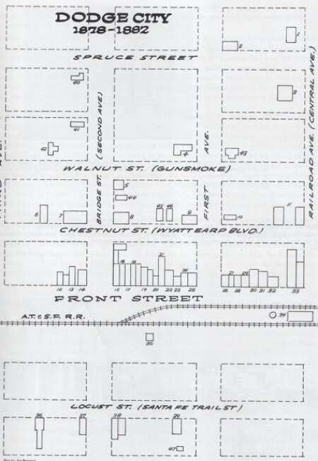 All’angolo tra la Seconda Avenue e Front Street c’era il negozio di selleria e pellame di Isaac Young e il drug store di Herman J. Finger. Allo stesso angolo, ma dalla parte opposta, c’era l’emporio di Charles Rath, quindi il saloon di George Hoover, l’armeria di Fred Zimmermann, il saloon di A. J. Peacock e il saloon di P. L. Betty e James H. Kelly. Quest’ultimo, conosciuto anche come Alhambra, era stato smontato a Hays City e rimontato tale e quale in Front Street.