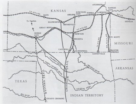 I “Long Horn”, attraverso la pista Chisholm arrivavano ad Abilene, la prima delle città del bestiame. Man mano che la ferrovia avanzava verso ovest, fu la volta di Ellsworth, Newton, Wichita e infine Dodge City.