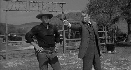 In “Ombre rosse” la sfida finale non si vede nemmeno, lasciando intuire che Ringo Kid (Wayne) armato di Winchester, abbia eliminato i tre fratelli Plummer e ne “L’uomo che uccise Liberty Valance”, è ancora Wayne, nei panni di Tom Doniphon, ad abbattere il fuorilegge (Lee Marvin) con un perfetto colpo di carabina sparato da un vicolo buio (si noti anche la coincidenza che in entrambe le situazioni lo scontro avviene di notte, quasi che Ford volesse nasconderlo, forse per lasciare maggior spazio all’immaginazione dello spettatore).