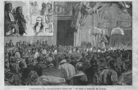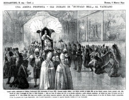 Roma. 3 Marzo, 1890 – Uno degli spettacoli più curiosi mai visti prima entro le venerabili mura del Vaticano fu la spettacolare entrata di “Buffalo Bill”, alla testa dei suoi Indiani e cowboys questa mattina, quando la corte militare eccle- siastica e secolare del Papa era riunita per presenziare al Te Deum di Leo XIII per il dodicesimo anniversario della sua incoronazione. Nel mezzo di una scena di supremo splendore, affollata della vecchia aristocrazia Romana e circonda- ta dalle pareti immortalate da Michelangelo e Raffaello, là improvvisamente apparve una schiera di selvaggi con i colori di guerra, le piume in capo e le coperte, armati di asce e coltelli.