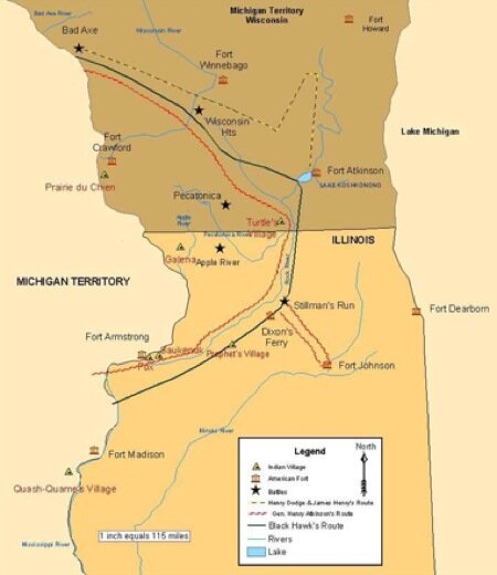 Il 5 aprile 1832, Falco Nero attraversò il Mississippi presso Yellow Banks (attuale Oquawka, Illinois) con quasi 2000 Sauk, e iniziò la “Guerra di Falco Nero”. Per evitare la guarnigione di Fort Armstrong, i Sauk si diressero a nord est fino ad intercettare il fiume Rock, ad est di Saukenuk con l’intenzione di risalirlo fino al villaggio del Profeta Winnebago, vicino all’attuale confine tra Wisconsin e Illinois. Due messaggi arrivarono dal generale Atkinson: il primo ordinava ai Sauk di ritornare nello Iowa; il secondo minacciava l’uso della forza se non l’avessero fatto.