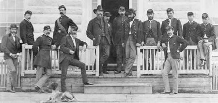 Gruppo di ufficiali di Fort Ellis. Appoggiato alla ringhiera: Maggiore Baker