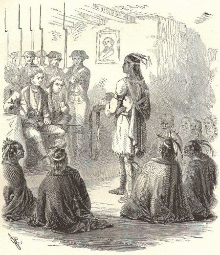 Alla Casa del Consiglio trovarono il maggiore Gladwin, il suo assistente, capitano Campbell, e altri ufficiali che si erano già riuniti e li stavano aspettando. Se gli Indiani avevano sospettato la scoperta del loro piano, non ebbero più dubbi quando videro che gli ufficiali avevano le spade al fianco e pistole infilate nelle cinture. Fu con qualche riluttanza che si sedettero sui tappetini preparati per loro. Era un momento difficile per Pontiac: era stato scoperto, sconfitto. Ma non si perse d’animo di fronte agli sguardi degli Inglesi che lo fissavano. «Perché – chiese con voce dura e severa – oggi i nostri fratelli si incontrano con noi con i fucili in mano?» Il comandante, calmo, rispose: «Sei arrivato tra noi proprio mentre siamo impegnati nelle nostre esercitazioni militari». Avendo un po’ sopito i suoi timori, Pontiac cominciò a parlare: «Per molte lune l’amicizia dei nostri fratelli inglesi è sembrata addormentata. Adesso è primavera; il sole splende caldo e luminoso; gli orsi, le querce, i fiumi si risvegliano dal sonno. I nostri capi sono venuti per fare la loro parte, per rinnovare le loro promesse di pace e amicizia». A questo punto fece un movimento con la cintura che teneva in mano, come per ruotarla. Gli Indiani erano pronti a scattare. Gladwin diede un segnale. Un clangore di armi risuonò al di là della porta aperta. Un tamburo rullò il segnale di carica. Nella sala del consiglio c’era un silenzio stupito. La mano di Pontiac si fermò e la cintura tornò nella posizione iniziale. Il rumore di armi cessò. Pontiac rinnovò le promesse di amicizia e lealtà e poi sedette.