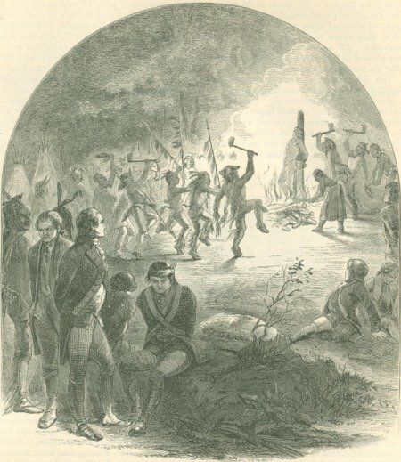Nel frattempo Pontiac, cupo di rabbia, si affrettava verso il suo villaggio al di là del fiume. Non c’era nessuno, tranne poche squaw e qualche vecchio. A questi Pontiac ordinò di smontare il campo far sì che tutto fosse pronto per la partenza, non appena tornassero gli uomini con le canoe per trasportare tutti i bagagli dal lato del fiume su cui sorgeva Detroit. Tutti lavorarono per eseguire la volontà del capo, mentre lui si appartava e si anneriva la faccia. Al cadere della notte tornarono i guerrieri con gli scalpi che avevano preso. Venne piantato un palo sul terreno aperto dove prima c’erano le tende. I guerrieri vi si radunarono intorno, con i corpi decorati con i vari colori e ornati di piume d’aquila. Pontiac saltò in mezzo a loro, brandendo la sua ascia e scuotendo violentemente il palo. Nel danzare esaltava le grandi gesta che lui e i suoi padri avevano compiuto in guerra. Le sue grida tremende, le sue parole terribili, scossero il cuore dei suoi guerrieri e scaldarono il loro sangue. Tutti erano in preda alla frenesia e all’eccitazione. Con grida selvagge si unirono al loro capo nella danza di guerra. Anche solo la debole eco del clamore di quella bolgia suscitò il terrore nei cuori degli abitanti di Detroit che ascoltavano. I soldati disposero una guardia molto serrata per tutta la notte, aspettandosi di essere attaccati in ogni momento. Penetranti e vicine, le grida di guerra nascevano da centinaia di gole. Gli uomini giravano attorno al palo al clamore dei canti e dei fucili scoppiettanti. Sembrava davvero che gli Indiani fossero proprio vicini alle mura del forte.
