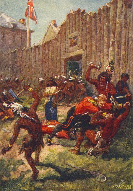 Gli uomini del forte tenevano ancora le porte chiuse e stavano dietro le loro palizzate, come se non avessero nessun interesse per il gioco. Effettivamente stavano guardando con preoccupazione la grande folla di Indiani così vicina a loro. Quando il gioco finì, Pontiac si avvicinò all’ingresso del forte. I suoi capi lo aspettavano e una variopinta folla di guerrieri, squaws e bambini venne radunandosi attorno. Il grande capo gridò a gran voce, richiedendo di entrare. La risposta fu che egli avrebbe potuto entrare, se lo desiderava, ma tutti gli altri sarebbero dovuti rimanere fuori. Con dignità offesa egli domandò se i suoi seguaci non avevano il permesso di gustare il fumo del calumet. Il comandante inglese, stanco di falsi discorsi, rispose brevemente, rifiutando assolutamente di permettere l’ingresso degli Indiani. Allora Pontiac si accigliò e si allontanò a grandi passi verso il fiume con grande indignazione. Gli altri si ritirarono un po’ indietro e ristettero in piccoli gruppi, mormorando e gesticolando. Poi si ritirarono con sordi brontolii per ricongiungersi ai loro compagni che se ne stavano sdraiati a terra attorno al campo di gioco. Dopo aver parlottato fra loro, alcuni si diressero con grida sanguinarie verso una casa nei campi dove viveva una donna inglese con i suoi bambini; altri balzarono nelle loro canoe pagaiando verso un’isola dove viveva da solo un agricoltore inglese. Prima del tramonto gli uomini del forte udirono l’esultante grido dello scalpo degli Indiani, e capirono che il primo sangue della guerra era stato versato.