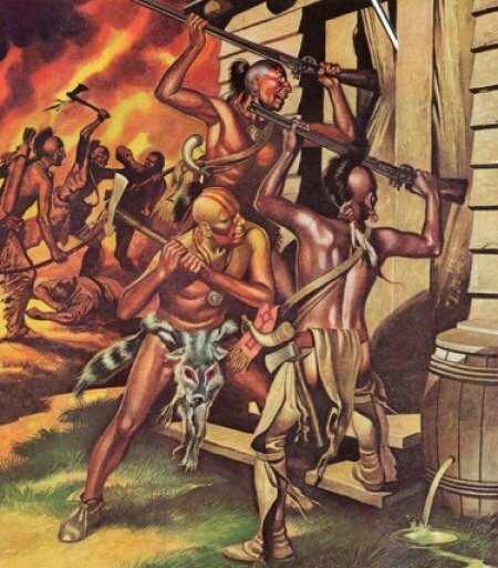 Le sentinelle sui bastioni, comunque, non potevano vedere il nemico nella tenue, grigia luce dell’alba. Da dietro ogni albero, ogni pietra, ogni gobba del terreno, provenivano gli incessanti lampi dei moschetti. Pallottole e frecce incendiarie si abbattevano sulle palizzate. Gli Indiani miravano alle feritoie e riuscirono a ferire cinque Inglesi. I soldati rispondevano con un fuoco limitato, non volendo sprecare polvere contro un nemico invisibile.