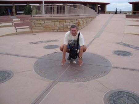 La gente si diverte a mettersi carponi con le mani e con i piedi a toccare gli angoli dei quattro Stati. Anche Fernando lo fa, come si può vedere dalla foto. Arriviamo a Durango nel tardo pomeriggio, mangiamo qualcosa e poi prendiamo il motel.