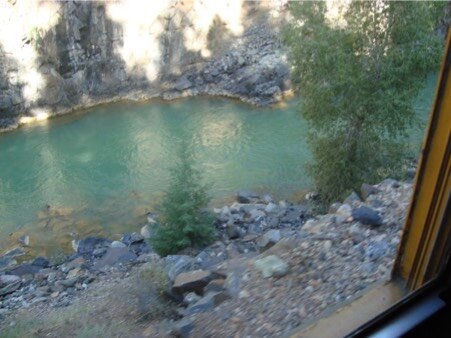La ferrovia si snoda lungo un percorso che attraversa luoghi incontaminati e selvaggi. Il treno va molto piano perché i binari sono situati a volte proprio lungo il margine a strapiombo della montagna. Viene la pelle d’oca a guardare giù. Il treno è stupendo, molto simile a quelli che solcavano il west nell’ottocento.