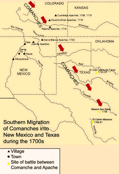 L’ostilità tra Spagnoli e Comanches scoppiò intorno al 1740. I motivi non sono del tutto chiariTra il 1741 e il 1749 i Comanches incominciarono a assalire i Pueblo di Pecos e Galisteo con grande furia, uccidendo più di 300 abitanti. Il Governatore Velez, che assunse la carica nel 1749, decise di fermare questi sanguinosi raids insediando a Pecos una guarnigione di 30 uomini e circondando Galisteo con muri e torri d’osservazione. ?Gli attacchi contro i 2 villaggi furono probabilmente una rivalsa verso l’ospitalità che i 2 pueblo avevano dato ai Plains Apaches. Erano in rapporto così amichevole con gli Apache, che questi ultimi lasciavano loro le donne e i bambini quando si avventuravano sulle pianure a caccia di bisonti. ?Gli ufficiali Spagnoli non associarono la presenza degli Apaches con la crescente ostilità, anzi Velez riteneva necessario trattenerli vicino a Pecos per aumentare le difese e usarli come spie, visto che si spingevano nelle pianure, a differenza dei Pueblos. Sia i Plains Apaches che gli Jicarillas servivano, poi, gli Spagnoli come soldati e scouts. Nel 1760 il Vescovo Tamaron incontrò, tramite i Pueblo di Santo Domingo, un leader di “pacifici Apaches” che era molto stimato nel regno perchè avvisava lealmente dell’avvicinarsi degli scorridori Comanches e era un alleato sicuro in guerra.