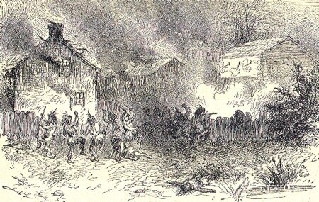 Dopo ore di combattimento e molti guerrieri caduti, gli Indiani divennero ancora più furenti e decisero di ricorrere ad un altro stratagemma. In questo ebbero completo successo: incendiarono il bosco sopravvento agli Inglesi. Il fuoco, a causa del vento e della secchezza dell’erba e dell’altra vegetazione, si estese con grande rapidità. Gli Inglesi furono scacciati dalla furia delle fiamme dalla loro posizione vantaggiosa e rimasero così esposti ai tomahawks degli Indiani. In quella giornata, solo 14 Inglesi riuscirono a fuggire e sopravvissero.