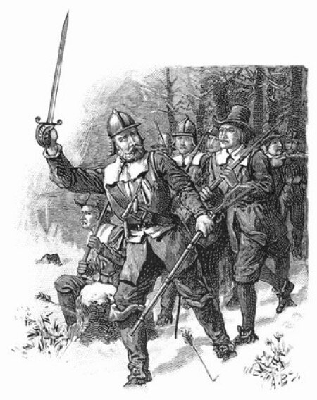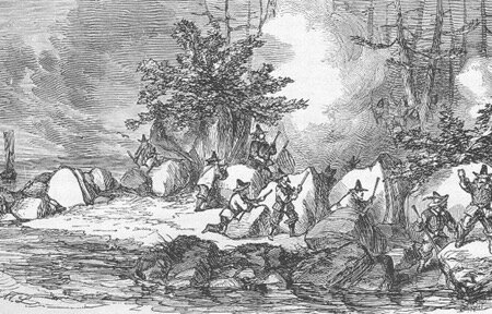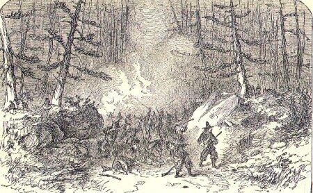 «Partimmo con i carri carichi di vettovaglie e di munizioni all’inizio dell’estate. Mio zio comandava un piccolo esercito, composto da 120 regolari, da un gruppo di abitanti di Bridgewater arruolatisi di fresco e ansiosi di vendicare non so quale torto fatto loro dagli Indiani, e da 30 battitori indigeni. Questi ultimi avevano il compito di individuare le bande; e poi, sparando e facendo fracasso, di spingerle verso la linea dei soldati appostati.