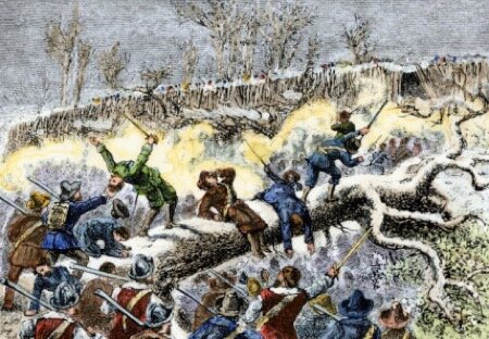 C’era solo un punto dove la fortificazione poteva essere attaccata con una qualche possibilità di successo, ed questo era rinforzato da un ulteriore fortino posto proprio di fronte all’ingresso. Il tutto era protetto da alte palizzate e un enorme ammasso di tronchi d’albero lo circondava da tutti i lati. Tra il forte e lo spazio antistante vi era un canale pieno d’acqua, che si sarebbe potuto attraversare solo passando su un grande tronco d’albero che era gettato tra le due rive. Il posto aveva l’aspetto di un forte formidabile, che presentava enormi difficoltà di avvicinamento. Avvicinandosi al punto, i soldati inglesi, cercando di passare sul tronco d’albero in fila indiana (il solo modo possibile), furono subito presi d’infilata dal fuoco nemico. E sempre altri, condotti dai loro comandanti, prendevano il posto dei caduti. Anche questi subivano lo stesso fuoco spaventoso, con gli stessi effetti fatali.