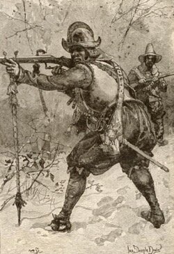 Nei giorni seguenti Metacomet udì ulteriori notizie sugli Inglesi. Erano sbarcati una terza volta. Gli Indiani li avevano controllati a distanza. Finalmente, quando capitò l’occasione buona, trenta o quaranta Nativi circondarono silenziosamente le Facce Pallide e, al segnale convenuto, ciascuno di loro cominciò a lanciare urla al massimo delle sue possibilità vocali e a tirare frecce contro gli odiati visitatori. Per un certo tempo sembrò che i Visi Pallidi sarebbero stati respinti in acqua. Ma presto reagirono con i loro fucili, e gli Indiani fuggirono, spaventati dal rumore di quelle armi. Metacomet fu grandemente interessato dalla descrizione che fu fatta del fucile. Non ne aveva mai sentito parlare prima e pensò che fosse molto strano che tutti potessero essere spaventati da piccoli pezzi di piombo. Non poteva sapere perché non era facile schivare le pallottole come era facile scansare le frecce.