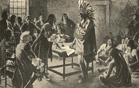 Poi Massasoit descrisse il trattato che aveva concluso con i visi pallidi, con il quale i coloni e i Wampanoag si erano accordati per restare amici e per aiutarsi a vicenda in ogni modo che avessero potuto. Per rendere il trattato il più forte possibile, le facce pallide lo avevano scritto sulla carta e vi avevano scritto i propri nomi. Gli Indiani non sapevano leggere e scrivere. Era qualcosa di cui non avevano mai sentito parlare. Ma essi disegnarono rozze figure alla fine dello scritto e affermarono che quei dipinti erano i loro nomi.