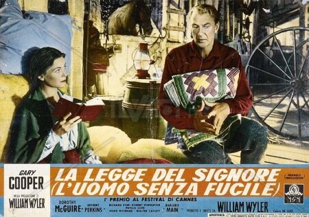 “La legge del Signore”, ispirato al romanzo “The Friendly Persuasion” di Jessamyn West che dà anche il titolo originale alla pellicola, ottiene una messe di nomination – addirittura 6 all’Oscar e 3 al Golden Globe – e lascia una viva impressione per i suoi contenuti anti-militaristi. La regia è di William Wyler, di origine alsaziana, la sceneggiatura di Michael Wilson e la colonna sonora del solito Tiomkin, che otterranno le candidature al massimo riconoscimento insieme al regista, al miglior attore non protagonista Anthony Perkins e a Gordon Glennan e Gordon Sawyer per il miglior sonoro. La sesta nomination è per Wyler (miglior film).
