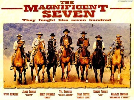 “The Magnificent Seven”, diretto da John Sturges, avrebbe dovuto rappresentare il top per il genere dedicato ai pistoleri e probabilmente la produzione si aspettava qualcosa di più di quanto il film non ottenne dalla critica, avendo assemblato un cast davvero d’eccezione. Oltre al notissimo Yul Brinner (“I dieci comandamenti” di Cecil B. De Mille, 1956) vi figuravano infatti Steve McQueen, Charles Bronson, James Coburn, Eli Wallach, Robert Vaughn, Horst Buchholtz e una sfilza di caratteristi. La trama, ispirata come si è detto ad un lavoro di Kurosawa, era sceneggiata da William Roberts, con la fotografia di Charles Lang jr. e le musiche di Elmer Bernstein. La vicenda è quella di un povero villaggio di contadini messicani vessati dalla banda di Calvera (Wallach) che puntualmente li depreda di tutto quanto posseggono, scorte alimentari incluse, fino a quando gli oppressi non si decidono ad ingaggiare dei professionisti per difenderli.