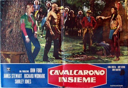 Di tutt’altro genere, sebbene ancora imperniato sulle malefatte dei Comanche, “Two Rode Together”, di John Ford, tradotto quasi letteralmente in italiano con “Cavalcarono insieme” e girato ad Alamo Village, Brackettville (Texas) dove Wayne aveva ambientato “La battaglia di Alamo”. Un giudizio che prescinde dall’opinione del regista è che si tratti di una delle opere più incisive di Ford, per l’intenso pathos di cui è permeata dall’inizio alla fine. Ricavato dal racconto “Comanche Captive” di Will Cook – scrittore western di grido – e sceneggiato da Frank S. Nugent, descrive la tragica spedizione di una carovana di coloni che cercano di riavere i propri parenti catturati molti anni addietro dai Comanche di Quanah Parker. Incaricati della mediazione sono lo sceriffo di Tascosa, Guthrie Mc Cabe (James Stewart) che si rivela agli inizi cinico e venale, e l’attempato tenente dell’esercito Jim Gary (Richard Widmark). Il recupero avviene soltanto parzialmente, perché il giovane Lupo Veloce (David Kent) si scoprirà essere il fratello di Marty Purcell (Shirley Jones) ma troppo tardi per evitargli il linciaggio da parte degli stessi coloni; l’altro ostaggio è la messicana Elèna de la Madriaga (Linda Cristal) divenuta controvoglia la moglie di Orso di Pietra (un Woody Strode “indianizzato” per l’occasione) e oggetto della morbosa curiosità delle donne del presidio, che la tormentano con le loro allusioni ai rapporti sessuali avuti con un selvaggio pagano. Alla fine, mentre l’impenitente scapolo Gary farà una promessa a Marty di rivederla, lo sceriffo Mc Cabe si dimostrerà assai meno prevenuto verso la squaw bianca recuperata, partendo per la California insieme a lei dopo che la sua compagna Belle (Annette Hayes) si è messa con un altro.