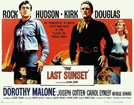 “The Last Sunset”, di Robert Aldrich, adattato molto liberamente dal romanzo “Sundown at Crazy Horse” di Howard Rigsby, secondo il critico americano Leonard Maltin, “è un po’ fuori dai canoni” perché “contiene di tutto, dall’incesto agli Indiani”. (Leonard Maltin, “Guida ai film 2008”, Dalai Editore, Milano, p. 1403). Sceneggiato abilmente da Dalton Trumbo, venne interpretato da Kirk Douglas (Brendan O’Malley) Rock Hudson (Dana Stribling) Dorothy Malone (Belle Breckenridge) Joseph Cotten (John Breckenridge) e Carol Lynley (Melissa, “Missy”) che lo stesso anno recita il ruolo di Allison Mackenzie in “Ritorno a Peyton Place”. La storia si snoda in una fascia di confine fra Messico e Stati Uniti, dove il pistolero O’Malley, inseguito dallo sceriffo Stribling, ottiene ospitalità nel ranch di John Breckenridge, la cui moglie è stata a suo tempo amante del ricercato. Nessuno, a parte Belle, sa che O’Malley è il padre di sua figlia Missy, una graziosa biondina subito affascinata dalla personalità del bandito, con il quale intreccia un delicato flirt, rimasto fortunatamente a livello abbastanza superficiale. Durante il tragitto – Stribling e O’Malley devono condurre una mandria nel Texas, per conto di Breckenridge, che tuttavia resterà ucciso in una rissa – l’amore fra Missy e il padre naturale rischia di trasformarsi in un rapporto molto serio e completo e Belle si decide a rivelare la verità al suo ex spasimante per impedire che si trasformi in una vera e prropria unione. Sconvolto dalla verità appresa, l’uomo affronterà Stribling in duello non appena condotto il bestiame a destinazione, ma si presenterà allo scontro con la pistola scarica, facendosi deliberatamente uccidere.