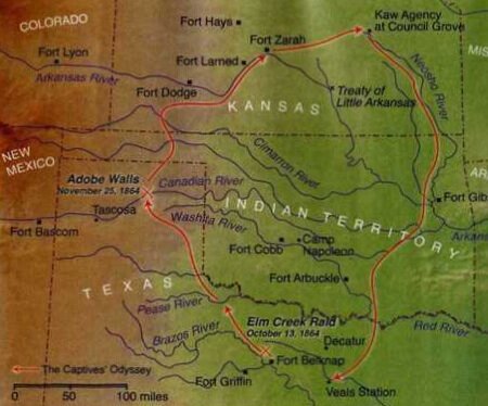 Tutta la milizia è andata a caccia di Indiani, disse qualcuno. Un ragazzo, Charles Tackett si offrì di cavalcare per 75 miglia fino a Veal’ Station. Partì all’una e, cambiando continuamente cavalcatura, arrivò a destinazione alle 9. Ma anche qui non c’era milizia. Un altro volontario raggiunse Decatur, distante 30 miglia. Qui il Maggiore Quayle fu informato del raid. Quayle radunò gli uomini e, senza indugio, galoppò per 80 miglia , finchè, a circa 20 miglia dall’Elm Creek, incontrò un cavaliere che lo informò del ritiro dei Comanches. Questo fu un tipico raid Comanche alla frontiera texana. Dodici bianchi morirono, undici case furono distrutte, sette donne e bambini rapiti. La gente di frontiera si salvò con coraggio e determinazione. La milizia, come sempre, arrivò in ritardo. I Comanches e i Kiowas razziarono quasi tutto e distrussero tutto quello che non riuscirono a portare via. I sacchi di farina furono vuotati o riempiti di sabbia, il bestiame ucciso. Quell’inverno fu durissimo sull’Elm Creek.