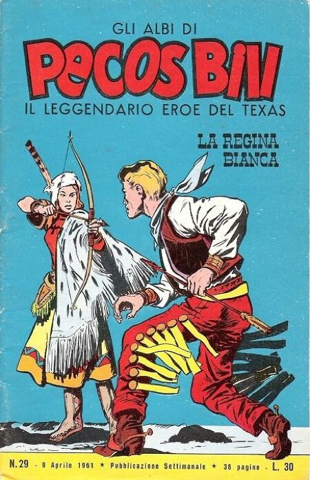 Ma la maggior parte dei disegnatori continuava a preferire personaggi più vicini ai gusti del pubblico dell’epoca, ancora molto legato al mito dell’eroe positivo. Nacque così il celebratissimo “Tex” di Aurelio Galleppini e Gianluigi Bonelli (1948), vagamente ispirato ad attori cinematografici del calibro di Gary Cooper e John Wayne, seguito a ruota da “Pecos Bill”, di Guido Martina e Paparella (1949) liberamente adattato da una leggenda molto cara ai mandriani del Texas, con l’aggiunta di figure di fantasia (l’unico che potesse vantare una matrice storica era Davy Crockett, rappresentato come barbuto e corpulento, in una veste assai goffa e assai poco somigliante a quella dell’eroe di Alamo). Vennero poi “Capitan Miki” (1951) e “Il piccolo sceriffo” (1952) due versioni similari di giovani dall’apparenza innocua e dal temperamento alla dinamite, per fortuna al servizio della legge e dell’ordine.